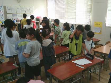 今日のなかよし集会は、一人20秒の間に答えの絵を見て答えの絵を描くことをつなげ、班のみんなで完成させるというもの。なかなかうまくフォローしていました。果たして、みんなが知っているアニメキャラクターは完成したでしょうか。