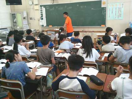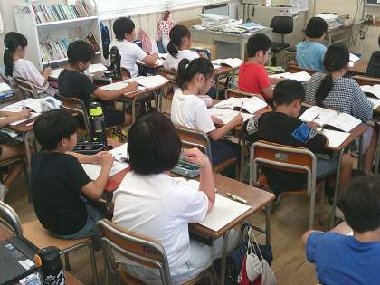 4年生の算数では、わり算の計算を言葉で説明することにチャレンジしていました。計算自体は難しくないのですが、それを言葉で説明することは結構難しいもの。みんなで正しい表現を完成させていました。