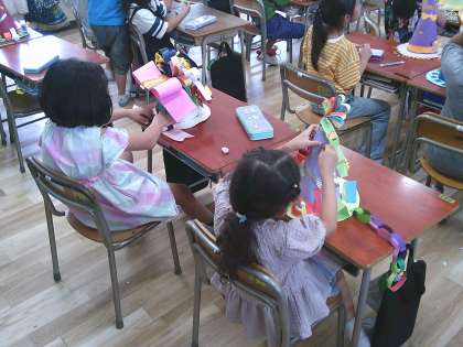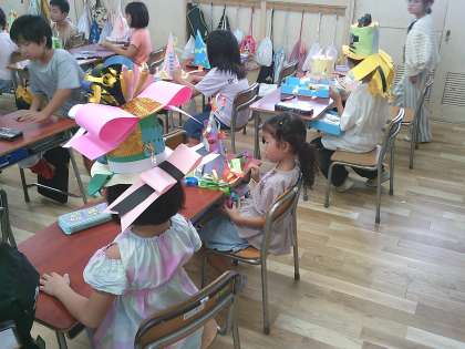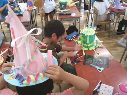 2年生の教室をのぞいてみると、自分が作成した格好いい帽子を仕上げて、試着しているところでした。このあと、講堂に持って行って並べたようです。
