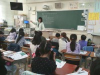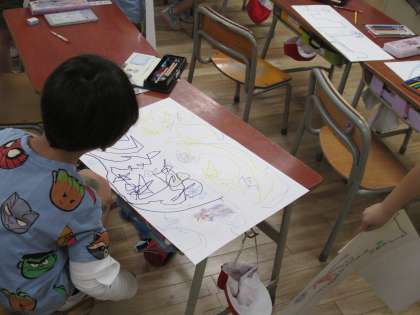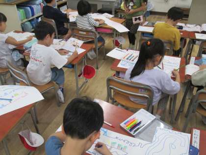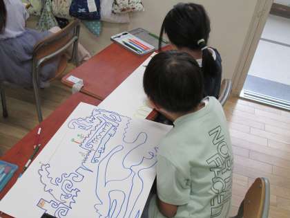 1年生では図工で「線のぼうけん」の学習に取り組みました。思い思いに線を伸ばしたり、つないだりしていろいろな形ができました。自分のイメージを膨らませ、できた形にカラフルな色をたくさんつけていました。