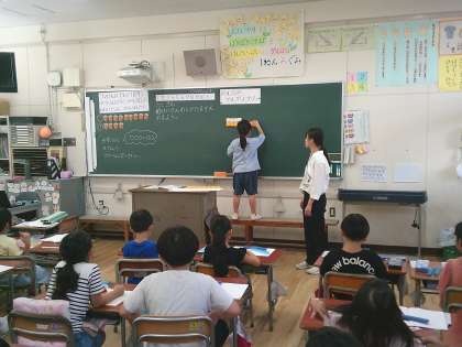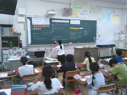 1年生の算数では、『9+4の計算の仕方を考えよう。』というめあてで学習しました。これまで10のかたまりをつくったことを思い出しながら、たす数を1と3に分け、たされる数に1をたして10のかたまりをつくっていました。