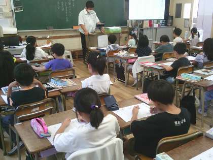 2年生の国語では、『音を作文に入れよう』と取り組んでいました。音とは、例えば『ガッシャーン』のように、ガラスが割れた時になるそれのようなものを指します。私たちの生活にある音を作文に入れることによって、読み手の想像を高めていくことをねらっています。