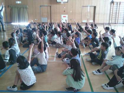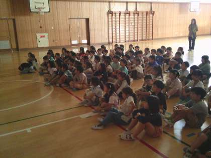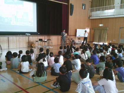 2年生は、今年の運動会で、アフリカのケニアの民族楽器『ニャティティ』で奏でた『ニャティティソーラン』にチャレンジするのですが、今年、ケニアに行かれた大阪市立学校の先生にお越しいただき、現地のお話を伺いました。