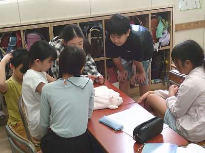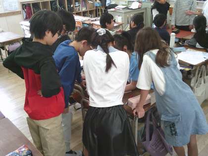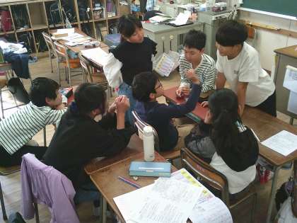 5年生の教室をのぞいてみると、体育で取り組んでいるリレーの作戦会議をしていました。どういう順番に走るのが良いのか、どの辺りでバトンを受けるのかなど、図を書きながらより具体的に話し合っていました。