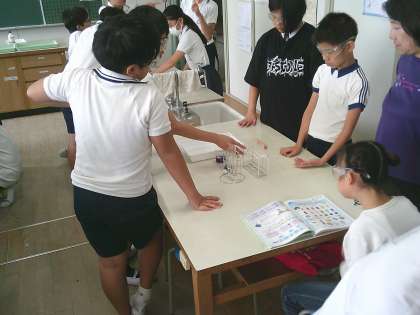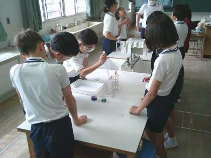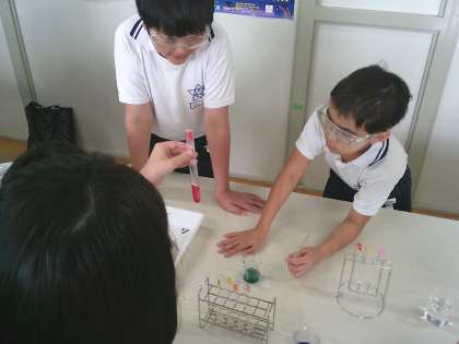 ゴーグルをして安全に行います。BTB溶液を入れると色が変わることに驚きつつも、「この色は何色かな」「だったらこれは〇性や!」と判断していました。