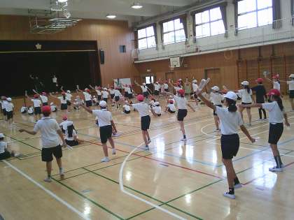 体育館をのぞいてみると、5年生の団体演技の練習をしていました。