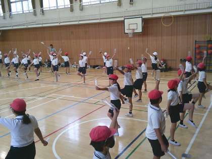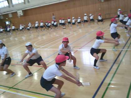 今年から団体演技がそれぞれの学年で行うことから、5年生は総合的な学習の時間に学習してきた沖縄つながりのものに取り組んでいます。結構難しそうです(^ ^;)