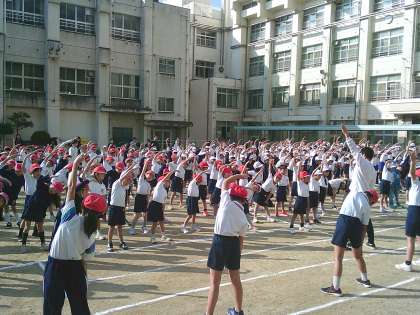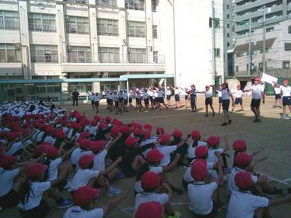 今日の1時間目、運動会の全体練習を行いました。開会式、プログラム1番ラジオ体操、応援合戦の練習をしました。