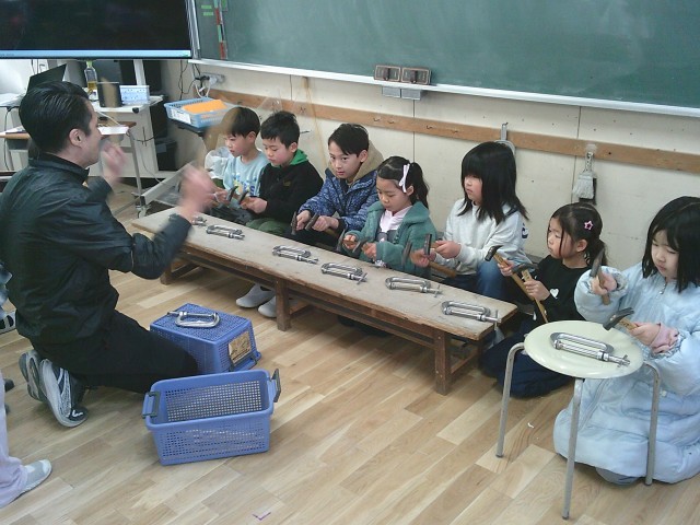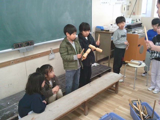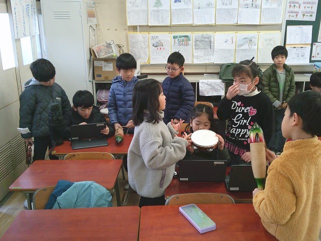 2年生をのぞいてみると、合奏に向けた練習が行われていました。よく見ると、楽器以外のものも登場していました(^ ^)