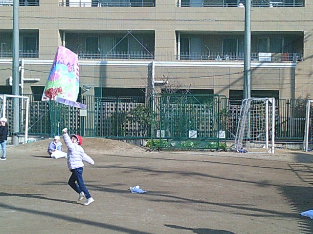 絶好のたこあげ日和!風を捕まえようと、みんな一生懸命に運動場を駆け回りました。