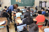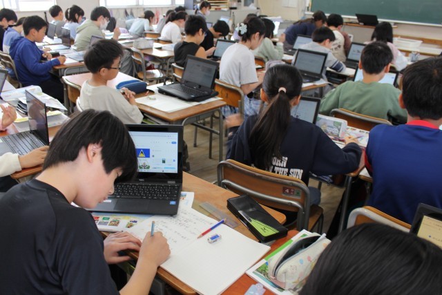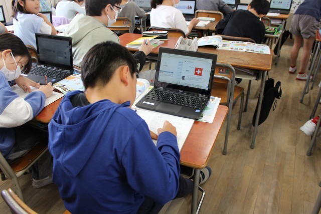 5年生の社会で自分が調べたい国の国旗を、地図帳や端末を使って調べています。国旗には、それぞれ意味や由来があります。「万博に行った時、コモンズで初めて知った国を調べています」という児童がいました。体験と学習がつながっていることを、とても頼もしく嬉しく感じました。