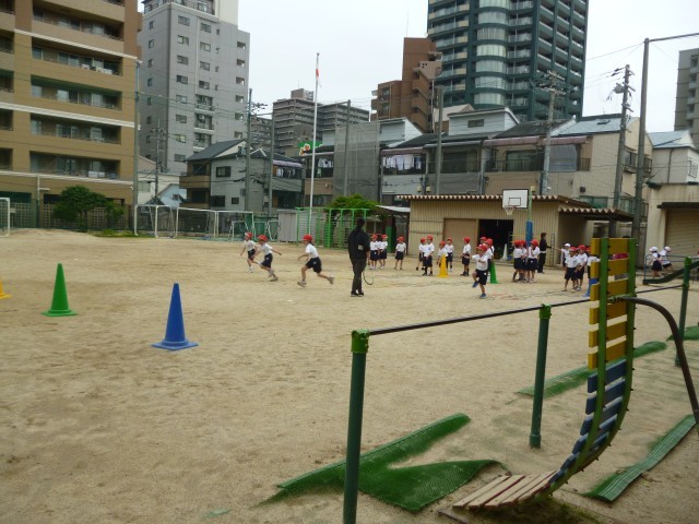 1年生の体育の時間です。ケンケンパなど、楽しんで運動遊びをしています。跳ぶ動作を繰り返し行い、リズム感を養います。また、友だちと関わりながら運動することで、協力する姿勢も生まれてきます。