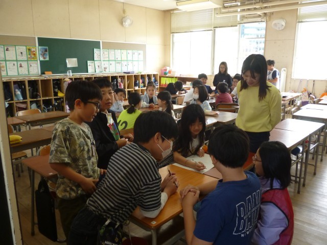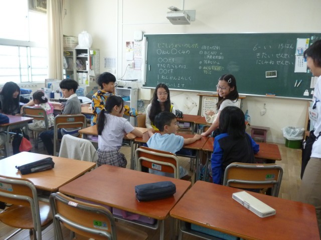 「何をして遊ぼうか」と、みんなで話し合っています。「しりとり」「ジェスチャーゲーム」「クイズ」など、いろいろな意見が出ていました。6年生がうまく話し合いをまとめていました。