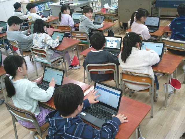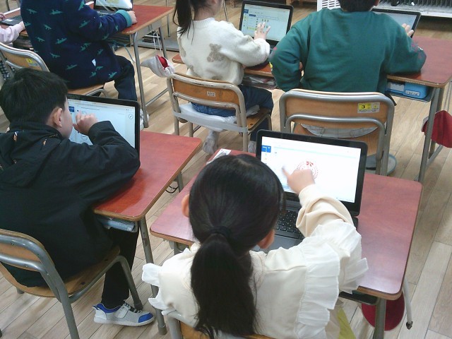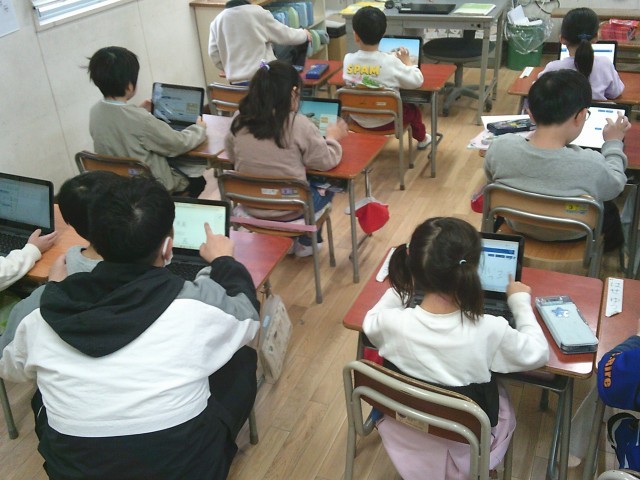 1年生の教室をのぞいてみると、デジタルドリル『ナビマ』で、漢字の読み書きの練習をしていました。