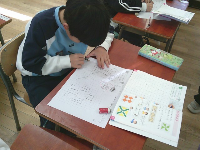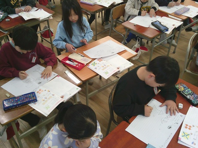 1年生の算数では、『てんとてんをむすんでかたちをつくろう!』と取り組んでいました。