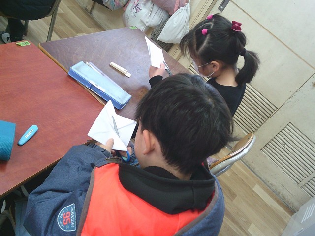 紙を折り重ねて印をつけたところを切るとできるというので、興味深そうに作業していました。