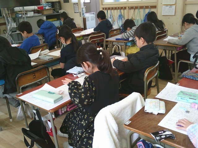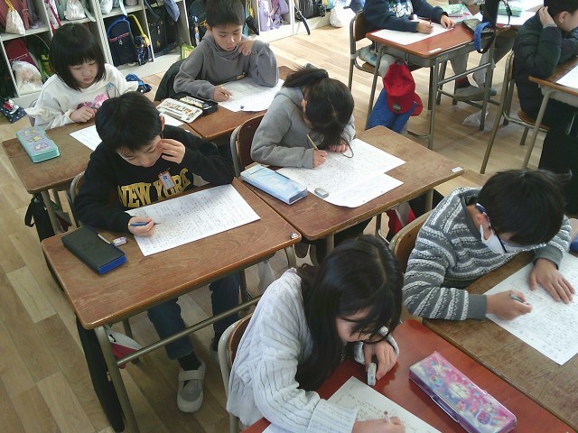 2年生の教室をのぞいてみると、3学期に習った説明文の振り返りプリントに取り組んでいました。