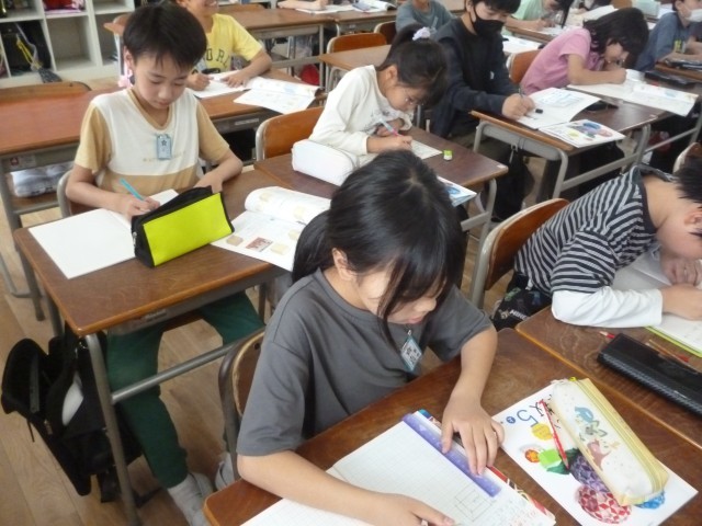 5年生の書写では、毛筆で書く時のポイントを学習しました。始筆や字の大きさや一画一画のつながりを意識するなど、改めて書くことと向き合っていました。