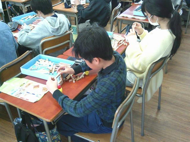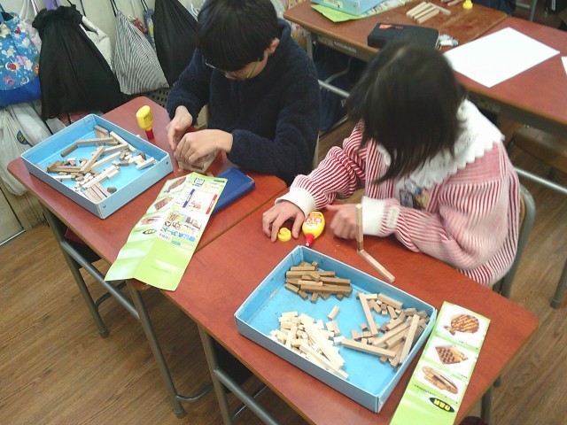 6年生の図工では、『寄せ木アート』にチャレンジしました。同じ数の同じ材料なのに、組み合わせていくと6年生の個性が感じられる作品となっていきます。