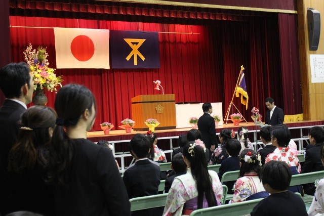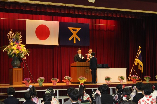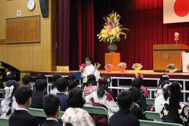 式では、卒業生が決意を述べたあと、舞台中央に進み、卒業証書を受け取りました。