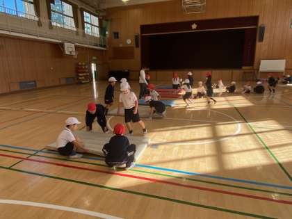 1年生の体育では、マット運動に取り組んでいました。グループで協力してマットを出すことも整列することもずいぶんテキパキできるようになってきました。