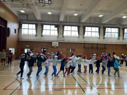 3箇所わかれて行うのですが、教室では3択クイズ、運動場ではドッヂボール、体育館ではじゃんけん列車をしました(^^)