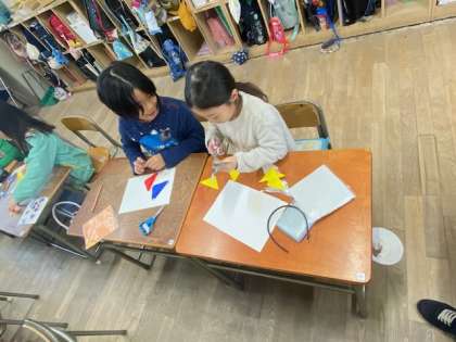 2年生の算数では、真四角に切った折り紙と真四角を半分に切った三角形を台紙に貼って様々な形を作っていました。