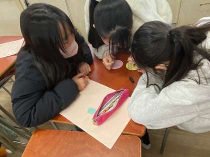6年生の教室をのぞいてみると、丸く切り抜いた色画用紙に、何やら感謝の言葉を書いていました。