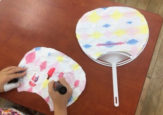 ・1年生が絵の具で色付けした和紙に、マジックで絵を描きました。それをうちわに貼り付けてオリジナルのうちわが完成しました。