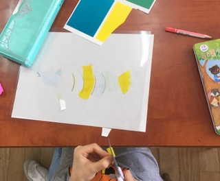 海底にすむ魚や宇宙に漂うロケットなど、一人ひとりが創造をめぐらせて楽しく作っていました。 -