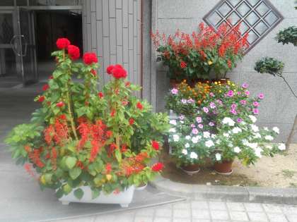 玄関にケイトウ、ニチニチソウ、サルビア、マリーゴールドがきれいに咲きそろっています。