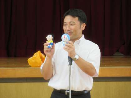 ◇「9月3日は誰の誕生日か知ってますか?」から始まった校長先生のお話。手にはドラえもんとのび太君の人形が...さてどんな内容だったのでしょうか。お子さまにたずねてみてください。
