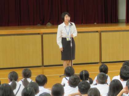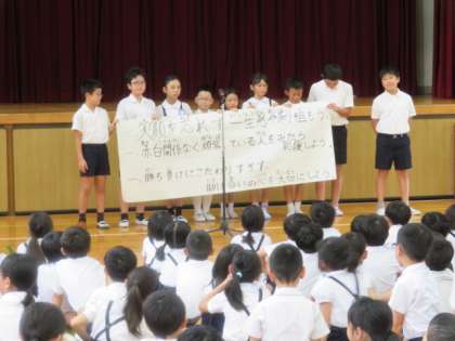 ◇今年度のスローガン「一人一人が思いやりのもてる生魂小学校にしよう!」を受けての運動会での目標が代表委員より発表されました。