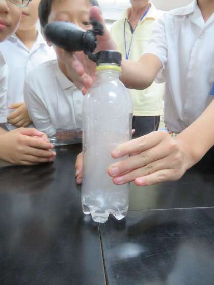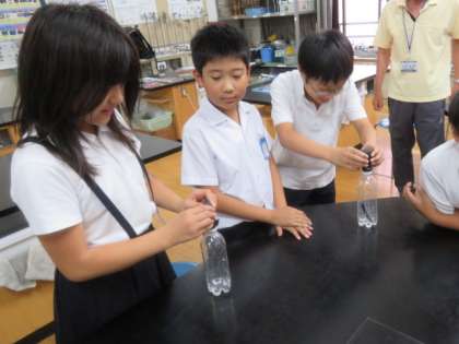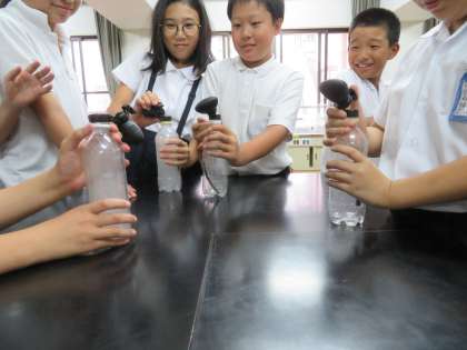 理科で雲の種類と天気のついて学習した5年生。今日は、ペットボトル内に圧力をかけた後、ふたを開けることで気温を下げ、雲粒をつくる実験をしました。パン!と大きな音がすると、ペットボトル内が真っ白に。
