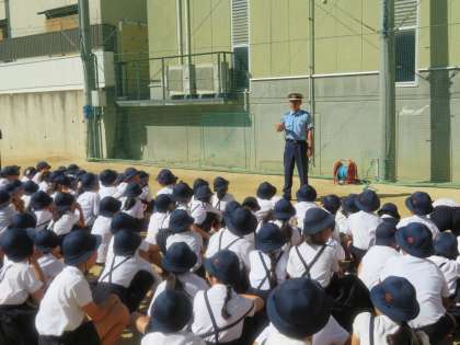 天王寺警察交通課の方から標識(とまれ,通学路,横断禁止)や横断時の注意について教えていただきました。「命は一つしかないよ。ルールを守り、必ず自分の目で左右を確認してから道路を渡りましょう。」