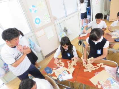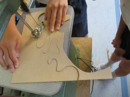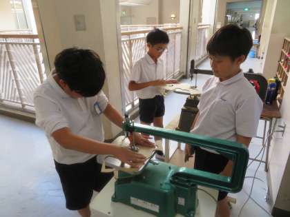 先週はミシンでエプロンをぬっていた5年生。今日は、同じような動きですが、板を電動糸のこぎりで思いのままにいろいろな大きさや形に切っていきました。これから、切り取ったパーツを組み合わせて何かに見立てていきます。