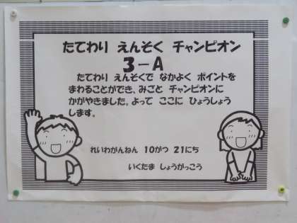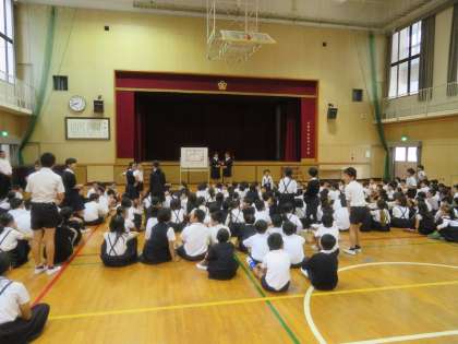 先日のたてわり遠足の表彰式を児童朝会で行いました。