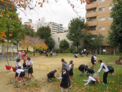 大阪マラソンクリーンUP作戦として、たてわり班で公園清掃を実施しました。いつも利用している上汐公園や上七公園をきれいにしようと、風とたたかいながら、一生懸命にゴミや落ち葉を拾ったり、雑草を抜いたりしていました。