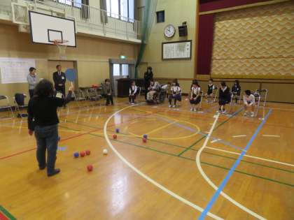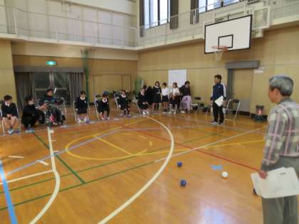 前回、初めてボッチャを体験した4年生。今日は、地域の生魂クラブ・NPO法人ムーブメント・社会福祉協議会・天王寺区役所の皆様とゲーム交流を行いました。