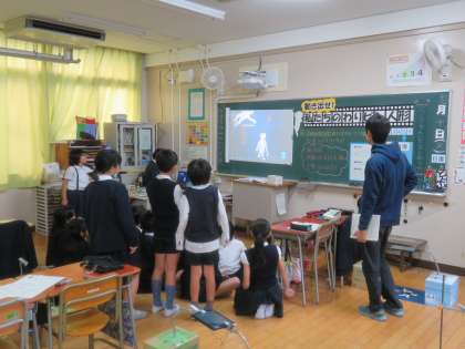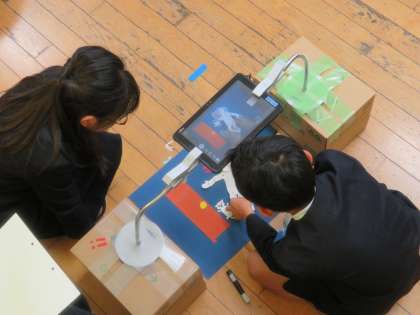 今、5年生は、わりピン人形や小道具を少しずつ動かしながら、タブレットでコマ撮りしてアニメーションをつくっています。2人1組でストーリーを考え、アイデアを出し合い、とても楽しそうに作業を進めていました。オリジナル・ミニアニメの完成が楽しみです。