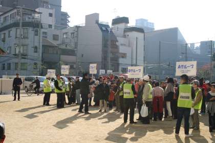 23日(日)本校運動場で生魂連合防災訓練が区役所、警察署、消防署、地域災害救助青年部等の関係諸団体の協力のもとおこなわれました。水消火器を使っての消火訓練、毛布を使っての担架づくり、ガラスふみ体験、防災クイズ等で防災意識を高めました。