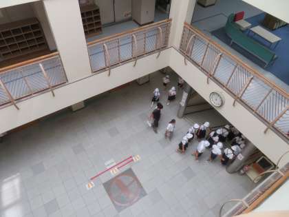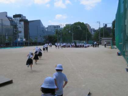 今日は、家庭科室で火災が発生したという想定で避難訓練を行いました。「お(さない)・は(しらない)・し(ゃべらない)・も(どらない)」の約束を守って運動場に避難しました。万が一の時は、あわてず騒がず、しっかり放送の指示を聞きましょう。