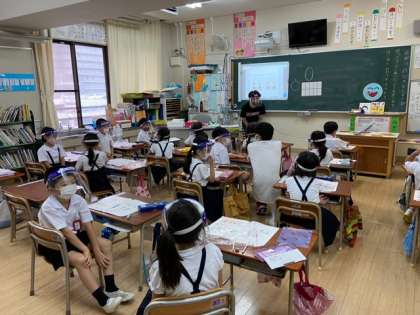 2人1組になって、10までの数字を「1ずつ」「2ずつ」などの条件で交互に唱えていきました。向かい合わせになるので、フェイスシールドをつけて活動しました。