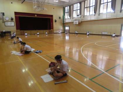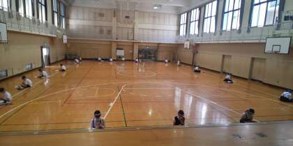 そこで、写真のように、講堂で間隔をあけ、フェイスシールドを着けるなどの飛沫感染予防をしながら練習に取り組んでいます。