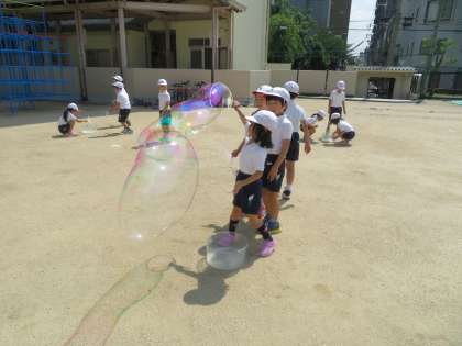 うちわの枠を使って、シャボン玉遊びをしました。グループに分かれて相談しながら大きなシャボン玉作りにチャレンジしていました。大きなのができると、みんな大騒ぎでシャボン玉を追いかけていました。