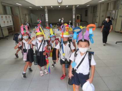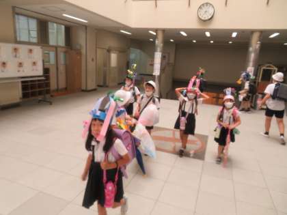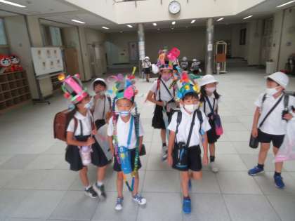 世界で一つだけの「すてきなぼうし」をかぶってうれしそうに下校する2年生。