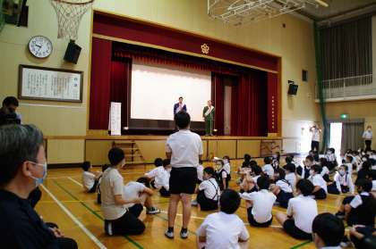 漫才の後の質問コーナーでは、「歯ブラシは何色ですか?」などかわいい質問も。子どもたちは、ミルクボーイのお二人が答えてくれるたびに、笑顔で拍手をしていました。