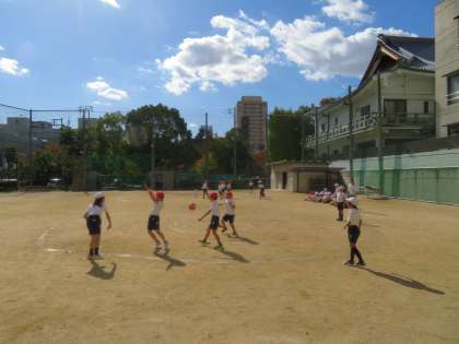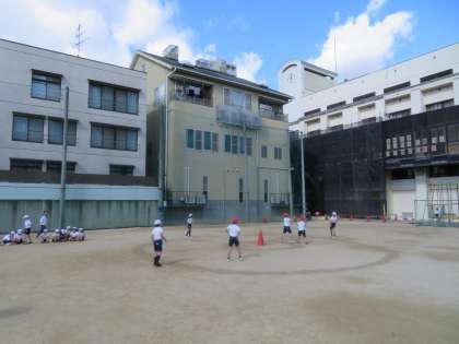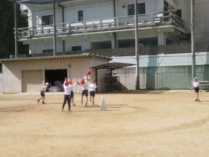 外側の線から中央の三角コーンをねらってボールを投げます。中の子どもたちは、コーンが倒されないようにボールをはじいたりキャッチしたりします。さあ、作戦は成功するかな?!