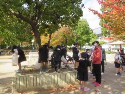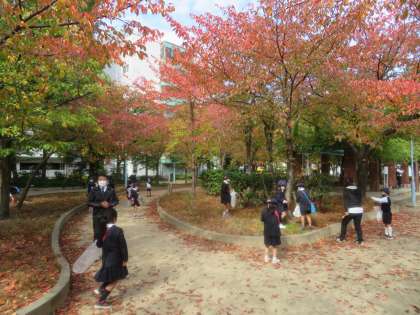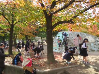 生活科の学習で上汐公園に秋見つけにやってきた1年生。赤や黄色に変身した落ち葉や枝などを拾って袋に集めていました。これから、国語や図画工作へと学習を広めていくそうです。