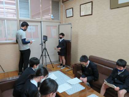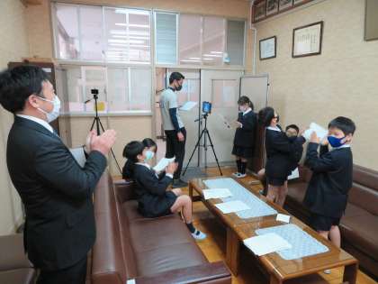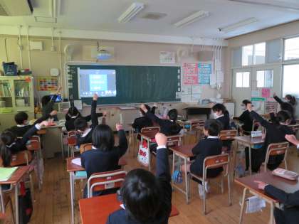 まだ全児童が講堂に集合できない状況なので、今年度の卒業生を送る会は、各教室と、6年生がいる講堂とをTeamsでつないだリモ—ト形式で行いました。